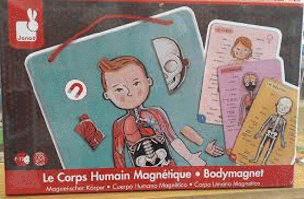Giza-anatomia ikasteko jolasa. Ikas itzazu gorputz atalak gozatzen zaren bitartean! 76 iman eta euskarri magnetiko bat gorputz atal desberdinen izenak ikasi eta osatzeko. Eskeletoa, organoak, giharrak eta gizakiaren gorputz atal ezberdinei buruzko informazioarekin 4 txartel ere ditu barne. Egurrezko hagatxo adierazlea dakar.