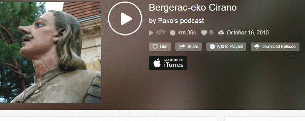 Bergerac-eko Cirano [Interneteko baliabidea - Audioa] / iturria, ezezaguna ; irakurleak, Joseba Gallastegi, Pako Eizagirre ; grabazioaren egilea, Pako Eizagirre