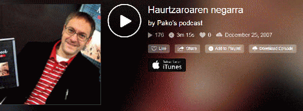 SoinuaHizkuntza: Basque Serie(ak): Literatur printzak hitz lauz (Pako Eizagirre)Publication details: [S.l.] : [s.n.], 2007Deskribapen fisikoa: Audioa (mp3) (4 min) : soinudunaGaia(k): Generoa/Forma:Sareko errekurtsoak:Adina / Maila: Pako Eizagirrek kudeatutako webgune honetan, "literatur printzak" entzun ahalko dira. Podcast laburrak dira euskal idazle ezagunen testuekin: egunkarietako artikuluak, liburuetako pasarteak...