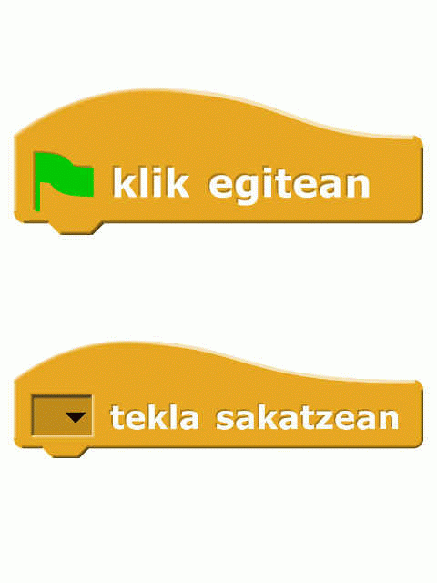 Gertaera blokeek programa baten pausoak noiz egin behar diren adierazteko balio dute. Programen hasiera bezala erabiliko ditugu, adibidez, "bandera klik egitean" blokea. Programazioan ohikoa izan ohi da "Kaixo mundua!" esanez hastea. Guk ere horixe egingo dugu.