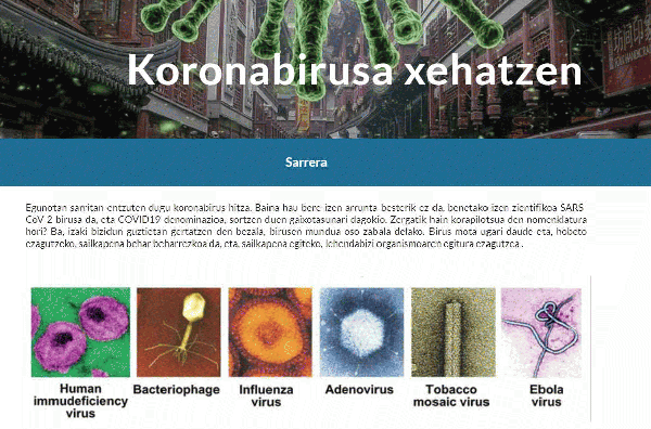 Koronabirusa xehatzen [Interneteko baliabidea - Webgunea - Erronka] / Miren Ariztegi (Ordiziako Berritzegunea), Pilar Etxebarria (Leioako Berritzegunea), Elvira González (Berritzegune Nagusia), J. Manuel López-Irastorza (Berritzegune Nagusia), Karlos Sukunza (Berritzegune Nagusia)