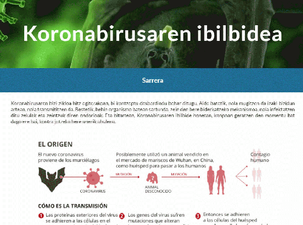 Koronabirusaren ibilbidea [Interneteko baliabidea - Webgunea - Erronka] / Miren Ariztegi (Ordiziako Berritzegunea), Pilar Etxebarria (Leioako Berritzegunea), Elvira González (Berritzegune Nagusia), J. Manuel López-Irastorza (Berritzegune Nagusia), Karlos Sukunza (Berritzegune Nagusia)