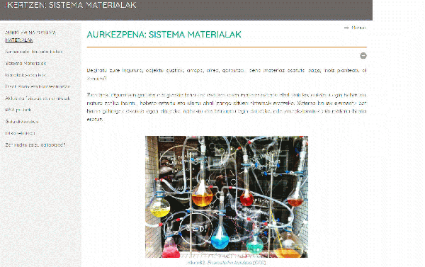 Begiratu zure ingurura, objektu guztiak, arropa, airea, gorputza... dena materiaz osatuta dago, inoiz planteatu al zenuen? Zientziak, inguratzen gaituen eta gizakia bera ere osatzen duen materia aztertu ahal izateko, antolatu egin behar du, natura zatika isolatu, hobeto aztertu eta ulertu ahal izango dituen sistemak eratzeko. Sistema hauek elementu bat baino gehiagoz osatuta egon daitezke, nahastu eta banandu egin daitezke, edo erreakzionatuz eta materia berria eratuz. probetas, alambiques, números Klare82. Erakusleiho kimikoa (CC0) Proposamen honen bidez, sistema material hauek ikertzera animatzen zaituztegu, misterioetan murgiltzera, geure sukaldaritza aztertzera, ingeniarien paperean jartzera, gure gosariko kakao aberats horren konposizioan sakontzera, esperimentu harrigarriak egitera eta zientziaren eta sasizientziaren arteko desberdintasuna egiaztatzera.