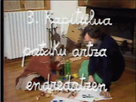 FilmSerie(ak): Haurrak euskalduntzen bideoaren bidez (Hezkuntza Saila) ; ; XIII-166 | Patxiku artza eskolan ; ; XIII-166Publication details: Vitoria-Gasteiz : Eusko Jaurlaritzaren Argitalpen Zerbitzu Nagusia, 1984Deskribapen fisikoa: 1 baliabide elektroniko (ca. 15 min) : soinuduna, kolGaia(k): Generoa/Forma:Sareko errekurtsoak:Adina / Maila: Haurren euskalduntzea laguntzeko helburuarekin, 1982. urtean Hezkuntza Sailak bideo sorta bat ekoiztu zuen Imanol Urbietaran zuzendaritzapean. Bideoetan euskara lantzeko hainbat elementu agertzen dira: ipuinak, marrazkiak, txotxongiloak, abestiak, motrizitatea... Bideo honek "Patxiku artza endredatzen" dauka izenburua.