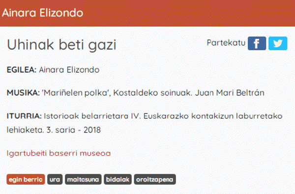 Etxegiroan taldekoen webgunean haur- eta gazte-literaturako eta helduen literaturako euskarazko testuak daude entzungai. Testuak, hotsak, doinuak jaso eta... audioen bildumak egin dituzte. Poemak, narrazioak, ipuinak edota iritzi artikuluak jasotzen dituzte, oso egokiak entzumena eta ulermena lantzeko, bai helduentzat eta baita haurrentzat ere. Kalitate handiko audioak daude tartean. Baita literatura aldetik aberatsak ere. Audio honetan Ainara Elizondoren "Uhinak beti gazi" izeneko ipuina entzun daiteke. Iturria: Istorioak belarrietara IV. Euskarazko kontakizun laburretako lehiaketa. 3. saria - 2018.