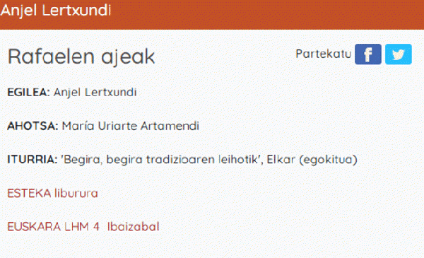 Rafaelen ajeak [Interneteko baliabidea - Audioa] / egilea, Anjel Lertxundi; " musika, 'Mariñelen polka', kostaldeko soinuak, Juan Mari Beltrán" ; ahotsa: María Uriarte