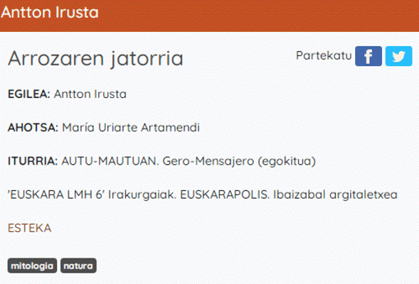 Arrozaren jatorria [Interneteko baliabidea - Audioa] / egilea, Antton Irusta ; " musika, 'Mariñelen polka', kostaldeko soinuak, Juan Mari Beltrán" ; ahotsa: María Uriarte