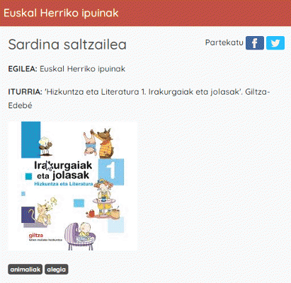SoinuaHizkuntza: Basque Serie(ak): Haur literatura euskaraz (Etxegiroan)Publication details: Elorrio : Etxegiroan, [2020]Deskribapen fisikoa: Audioa (mp3) (4 min) : soinudunaGaia(k): Generoa/Forma:Sareko errekurtsoak:Adina / Maila: Etxegiroan taldekoen webgunean haur- eta gazte-literaturako eta helduen literaturako euskarazko testuak daude entzungai. Testuak, hotsak, doinuak jaso eta... audioen bildumak egin dituzte. Poemak, narrazioak, ipuinak edota iritzi artikuluak jasotzen dituzte, oso egokiak entzumena eta ulermena lantzeko, bai helduentzat eta baita haurrentzat ere. Kalitate handiko audioak daude tartean. Baita literatura aldetik aberatsak ere. Audio honetan "Sardina saltzailea" izeneko ipuina entzun daiteke, 'Hizkuntza eta Literatura 1. Irakurgaiak eta jolasak'tik hartuta. Giltza-Edebé (2007).