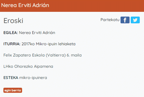 Etxegiroan taldekoen webgunean haur- eta gazte-literaturako eta helduen literaturako euskarazko testuak daude entzungai. Testuak, hotsak, doinuak jaso eta... audioen bildumak egin dituzte. Poemak, narrazioak, ipuinak edota iritzi artikuluak jasotzen dituzte, oso egokiak entzumena eta ulermena lantzeko, bai helduentzat eta baita haurrentzat ere. Kalitate handiko audioak daude tartean. Baita literatura aldetik aberatsak ere. Audio honetan Nerea Erviti Adriánen "eroski" izeneko ipuina entzun daiteke, 2017ko Mikro-ipuin lehiaketa irabazitakoa. Felix Zapatero Eskola (Valtierra) 6. maila