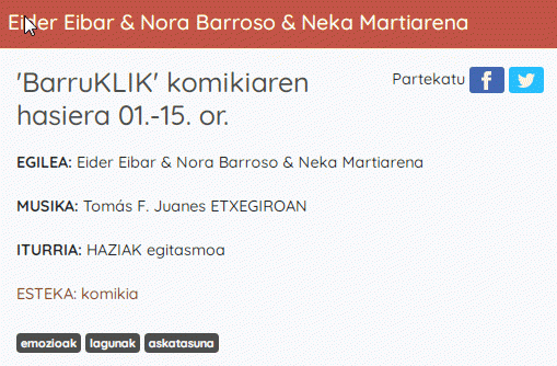 BarruKLIK [Interneteko baliabidea - Audioa] komikiaren hasiera 01.-15. or. / egilea, Eider Eibar, Nora Barroso eta Neka Martiarena ; ahotsa, María Uriarte Artamendi ; ekoizpena, Etxegiroan ; musika, Tomás F. Juanes