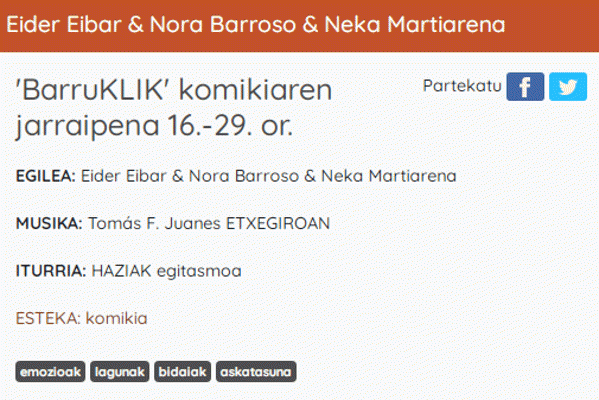 BarruKLIK [Interneteko baliabidea - Audioa] : komikiaren jarraipena 16.-29. or. / egilea, Eider Eibar, Nora Barroso eta Neka Martiarena ; ahotsa, María Uriarte Artamendi ; ekoizpena, Etxegiroan ; musika, Tomás F. Juanes