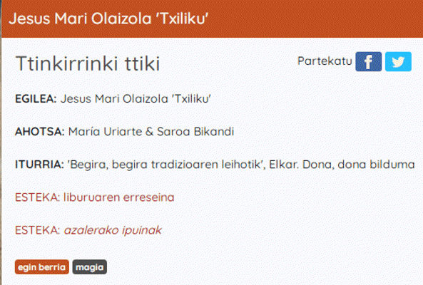 SoinuaHizkuntza: Basque Serie(ak): Haur literatura euskaraz (Etxegiroan)Publication details: Elorrio : Etxegiroan, [2020]Deskribapen fisikoa: Audioa (mp3) (2 min) : soinudunaGaia(k): Generoa/Forma:Sareko errekurtsoak:Adina / Maila: Etxegiroan taldekoen webgunean haur- eta gazte-literaturako eta helduen literaturako euskarazko testuak daude entzungai. Testuak, hotsak, doinuak jaso eta... audioen bildumak egin dituzte. Poemak, narrazioak, ipuinak edota iritzi artikuluak jasotzen dituzte, oso egokiak entzumena eta ulermena lantzeko, bai helduentzat eta baita haurrentzat ere. Kalitate handiko audioak daude tartean. Baita literatura aldetik aberatsak ere. Audio honetan Txilikuren "Ttinkirrinki ttiki" ipuina entzungo dugu.