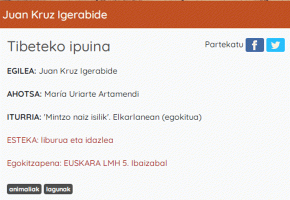 SoinuaHizkuntza: Basque Serie(ak): Haur literatura euskaraz (Etxegiroan)Publication details: Elorrio : Etxegiroan, [2020]Deskribapen fisikoa: Audioa (mp3) (6 min) : soinudunaGaia(k): Generoa/Forma:Sareko errekurtsoak:Adina / Maila: Etxegiroan taldekoen webgunean haur- eta gazte-literaturako eta helduen literaturako euskarazko testuak daude entzungai. Testuak, hotsak, doinuak jaso eta... audioen bildumak egin dituzte. Poemak, narrazioak, ipuinak edota iritzi artikuluak jasotzen dituzte, oso egokiak entzumena eta ulermena lantzeko, bai helduentzat eta baita haurrentzat ere. Kalitate handiko audioak daude tartean. Baita literatura aldetik aberatsak ere. Audio honetan Juan Kruz Igerabideren "Tibeteko ipuina" entzungo dugu. 'Mintzo naiz isilik'. Elkarlanean (egokitua). (2001).