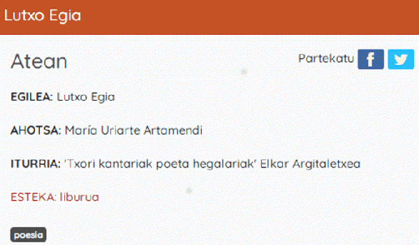 Etxegiroan taldekoen webgunean haur- eta gazte-literaturako eta helduen literaturako euskarazko testuak daude entzungai. Testuak, hotsak, doinuak jaso eta... audioen bildumak egin dituzte. Poemak, narrazioak, ipuinak edota iritzi artikuluak jasotzen dituzte, oso egokiak entzumena eta ulermena lantzeko, bai helduentzat eta baita haurrentzat ere. Kalitate handiko audioak daude tartean. Baita literatura aldetik aberatsak ere. Audio honetan 'atean' entzungo dugu. 'Txori kantariak poeta hegalariak' liburutik hartuta. Elkar Argitaletxea (2013).
