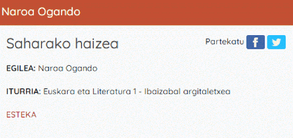 Etxegiroan taldekoen webgunean haur- eta gazte-literaturako eta helduen literaturako euskarazko testuak daude entzungai. Testuak, hotsak, doinuak jaso eta... audioen bildumak egin dituzte. Poemak, narrazioak, ipuinak edota iritzi artikuluak jasotzen dituzte, oso egokiak entzumena eta ulermena lantzeko, bai helduentzat eta baita haurrentzat ere. Kalitate handiko audioak daude tartean. Baita literatura aldetik aberatsak ere. Audio honetan Naroa Ogandoren 'Saharako haizea' ipuina entzungo dugu. "Euskara eta Literatura 1" liburuik hartuta - Ibaizabal argitaletxea.