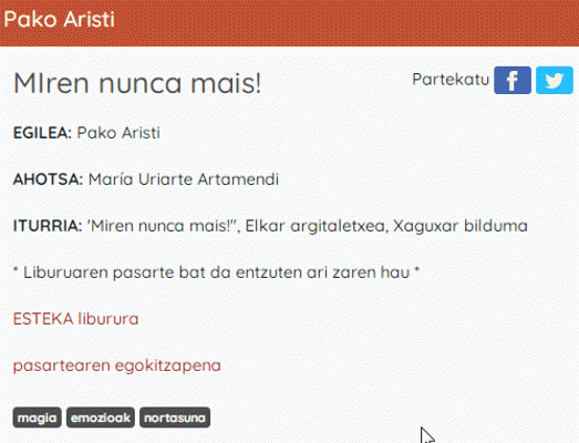 Etxegiroan taldekoen webgunean haur- eta gazte-literaturako eta helduen literaturako euskarazko testuak daude entzungai. Testuak, hotsak, doinuak jaso eta... audioen bildumak egin dituzte. Poemak, narrazioak, ipuinak edota iritzi artikuluak jasotzen dituzte, oso egokiak entzumena eta ulermena lantzeko, bai helduentzat eta baita haurrentzat ere. Kalitate handiko audioak daude tartean. Baita literatura aldetik aberatsak ere. Audio honetan Pako Aristiren 'Miren nunca mais!' ipuina entzungo dugu. 'Miren nunca mais!", Elkar argitaletxea, Xaguxar bilduma (2007).