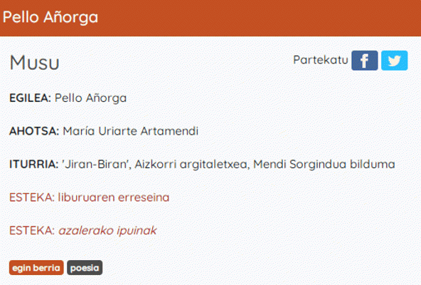 Etxegiroan taldekoen webgunean haur- eta gazte-literaturako eta helduen literaturako euskarazko testuak daude entzungai. Testuak, hotsak, doinuak jaso eta... audioen bildumak egin dituzte. Poemak, narrazioak, ipuinak edota iritzi artikuluak jasotzen dituzte, oso egokiak entzumena eta ulermena lantzeko, bai helduentzat eta baita haurrentzat ere. Kalitate handiko audioak daude tartean. Baita literatura aldetik aberatsak ere. Audio honetan Pello Añorgaren 'Musu' ipuina entzungo dugu. 'Jiran-Biran' liburutik hartuta, Aizkorri argitaletxea, Mendi Sorgindua bilduma.