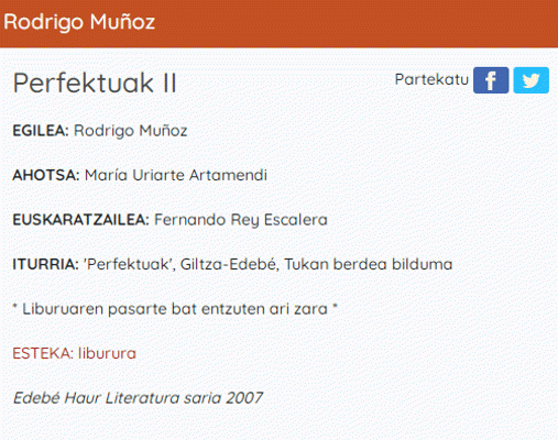 Perfektuak II [Interneteko baliabidea - Audioa] / ahotsa, María Uriarte ; egilea, Rodrigo Muñoz ; euskaratzailea: Fernando Rey Escalera