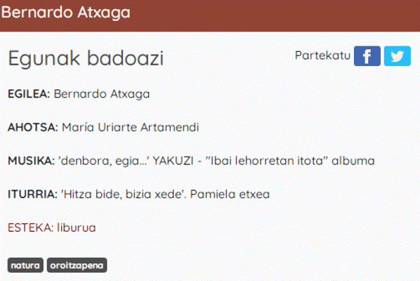Egunak badoazi [Interneteko baliabidea - Audioa] / egilea, Bernardo Atxaga ; ahotsa, María Uriarte Artamendi ; ekoizpena, Etxegiroan