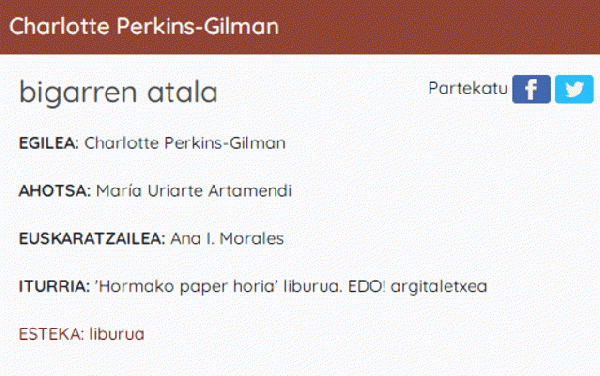 Hormako paper horia - bigarren atala [Interneteko baliabidea - Audioa] / egilea, Charlotte Perkins-Gilman ; ahotsa, María Uriarte Artamendi ; ekoizpena, Etxegiroan ; euskaratzailea: Ana I. Morales