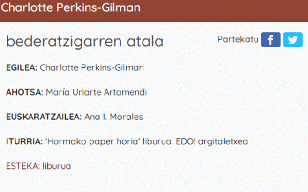 SoinuaHizkuntza: Basque Serie(ak): Helduentzako literatura euskaraz (Etxegiroan)Publication details: Elorrio : Etxegiroan, [2020]Deskribapen fisikoa: Audioa (mp3) (2 min) : soinudunaGaia(k): Generoa/Forma:Sareko errekurtsoak:Adina / Maila: Etxegiroan taldekoen webgunean haur- eta gazte-literaturako eta helduen literaturako euskarazko testuak daude entzungai. Testuak, hotsak, doinuak jaso eta... audioen bildumak egin dituzte. Poemak, narrazioak, ipuinak edota iritzi artikuluak jasotzen dituzte, oso egokiak entzumena eta ulermena lantzeko, bai helduentzat eta baita haurrentzat ere. Kalitate handiko audioak daude tartean. Baita literatura aldetik aberatsak ere. Audio honetan Charlotte Perkins-Gilmanen "Hormako paper horia" izeneko pasartea entzun daiteke. Iturria: 'Hormako paper horia' liburua. EDO! argitaletxea