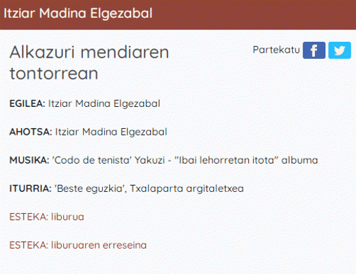 SoinuaHizkuntza: Basque Serie(ak): Helduentzako literatura euskaraz (Etxegiroan)Publication details: Elorrio : Etxegiroan, [2020]Deskribapen fisikoa: Audioa (mp3) (6 min) : soinudunaGaia(k): Generoa/Forma:Sareko errekurtsoak:Adina / Maila: Etxegiroan taldekoen webgunean haur- eta gazte-literaturako eta helduen literaturako euskarazko testuak daude entzungai. Testuak, hotsak, doinuak jaso eta... audioen bildumak egin dituzte. Poemak, narrazioak, ipuinak edota iritzi artikuluak jasotzen dituzte, oso egokiak entzumena eta ulermena lantzeko, bai helduentzat eta baita haurrentzat ere. Kalitate handiko audioak daude tartean. Baita literatura aldetik aberatsak ere. Audio honetan Itziar Madinaren "Alkazuri mendiaren tontorrean" izeneko pasartea entzun daiteke, "Beste eguzkia" liburutik. Txalaparta (2007).