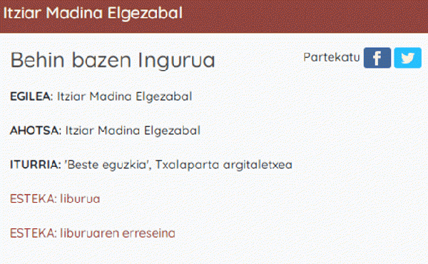 SoinuaHizkuntza: Basque Serie(ak): Helduentzako literatura euskaraz (Etxegiroan)Publication details: Elorrio : Etxegiroan, [2020]Deskribapen fisikoa: Audioa (mp3) (4 min) : soinudunaGaia(k): Generoa/Forma:Sareko errekurtsoak:Adina / Maila: Etxegiroan taldekoen webgunean haur- eta gazte-literaturako eta helduen literaturako euskarazko testuak daude entzungai. Testuak, hotsak, doinuak jaso eta... audioen bildumak egin dituzte. Poemak, narrazioak, ipuinak edota iritzi artikuluak jasotzen dituzte, oso egokiak entzumena eta ulermena lantzeko, bai helduentzat eta baita haurrentzat ere. Kalitate handiko audioak daude tartean. Baita literatura aldetik aberatsak ere. Audio honetan Itziar Madinaren "Behin bazen Ingurua" izeneko pasartea entzun daiteke, "Beste eguzkia" liburutik. Txalaparta (2007).