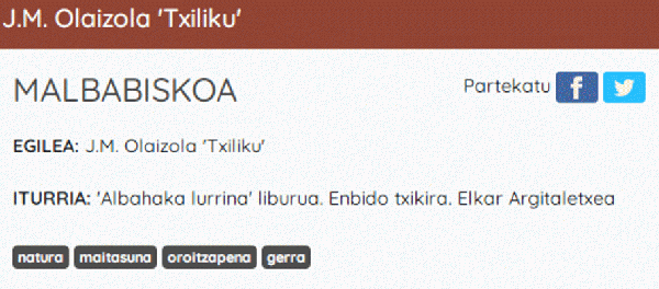 Etxegiroan taldekoen webgunean haur- eta gazte-literaturako eta helduen literaturako euskarazko testuak daude entzungai. Testuak, hotsak, doinuak jaso eta... audioen bildumak egin dituzte. Poemak, narrazioak, ipuinak edota iritzi artikuluak jasotzen dituzte, oso egokiak entzumena eta ulermena lantzeko, bai helduentzat eta baita haurrentzat ere. Kalitate handiko audioak daude tartean. Baita literatura aldetik aberatsak ere. Audio honetan J.M. Olaizola 'Txiliku'ren "Albahaka lurrina" liburutik hartutako "Malbabiskoa" izeneko pasartea entzun daiteke. Elkar Argitaletxea
