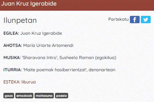Ilunpetan [Interneteko baliabidea - Audioa] / egilea, Juan Kruz Igerabide ; ahotsa, María Uriarte Artamendi ; ekoizpena, Etxegiroan