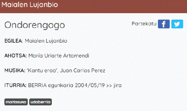 Ondorengogo [Interneteko baliabidea - Audioa] / egilea, Maialen Lujanbio ; ahotsa, María Uriarte Artamendi ; ekoizpena, Etxegiroan