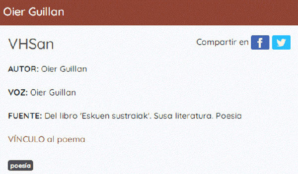 Etxegiroan taldekoen webgunean haur- eta gazte-literaturako eta helduen literaturako euskarazko testuak daude entzungai. Testuak, hotsak, doinuak jaso eta... audioen bildumak egin dituzte. Poemak, narrazioak, ipuinak edota iritzi artikuluak jasotzen dituzte, oso egokiak entzumena eta ulermena lantzeko, bai helduentzat eta baita haurrentzat ere. Kalitate handiko audioak daude tartean. Baita literatura aldetik aberatsak ere. Audio honetan Oier Guillanen 'VHSan' izeneko pasarte bat entzungo dugu. 'Eskuen sustraiak' liburutik hartuta. Susa literatura. Poesia