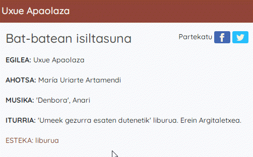 Bat-batean isiltasuna [Interneteko baliabidea - Audioa] / egilea, Uxue Apaolaza ; ahotsa, María Uriarte Artamendi ; ekoizpena, Etxegiroan