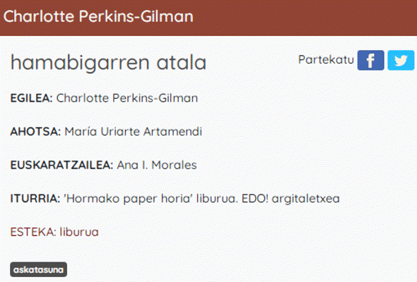 Hormako paper horia - hamabigarren atala [Interneteko baliabidea - Audioa] / egilea, Charlotte Perkins-Gilman ; ahotsa, María Uriarte Artamendi ; ekoizpena, Etxegiroan ; euskaratzailea: Ana I. Morales