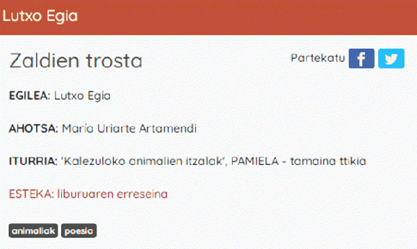 Etxegiroan taldekoen webgunean haur- eta gazte-literaturako eta helduen literaturako euskarazko testuak daude entzungai. Testuak, hotsak, doinuak jaso eta... audioen bildumak egin dituzte. Poemak, narrazioak, ipuinak edota iritzi artikuluak jasotzen dituzte, oso egokiak entzumena eta ulermena lantzeko, bai helduentzat eta baita haurrentzat ere. Kalitate handiko audioak daude tartean. Baita literatura aldetik aberatsak ere. Audio honetan 'bakardadea' entzungo dugu. 'Kalezuloko animalien itzalak' liburutik hartuta, Tamaina ttikia. Pamiela (1999).