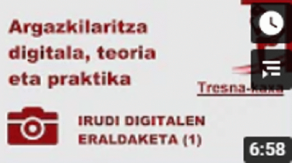 Argazkilaritza digitalaren teoria eta praktika: irudi digitalaren eraldaketa (1.2): tresna-kaxa [Interneteko baliabidea - Bideoa] / [gidoia eta muntaia, Txetxo Serrano ; aurkezpena, Fran Urteaga ; bideo-irudiak, Txetxo Serrano ... et al. ; aktoreak, Jokin Urteaga eta Maite Serrano ; grafikoak, Joseba Elorza; musika, Aitor de Olano]