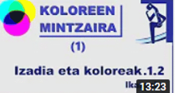Koloreen mintzaira. Bideo seriea DBHko laugarren kurtsoko ikasleentzat pentsatutako materiala da. Bere xedea koloreak nola eratzen diren, nola jasotzen dituzten gure begiek eta nolako adierak izan dituzten historian zehar erakustea da. Bideo honetan izadia eta koloreak.