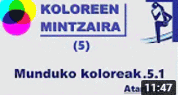 Koloreen mintzaira. Bideo seriea DBHko laugarren kurtsoko ikasleentzat pentsatutako materiala da. Bere xedea koloreak nola eratzen diren, nola jasotzen dituzten gure begiek eta nolako adierak izan dituzten historian zehar erakustea da. Bideo honetan munduko koloereak ikusiko ditugu.