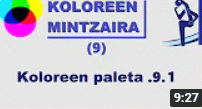 Koloreen mintzaira. Bideo seriea DBHko laugarren kurtsoko ikasleentzat pentsatutako materiala da. Zenbat kolore dago? Eguzkiaren espektroan berrehun bat omen daude. Iragazki egile batzuek zazpiehun eta berrogeita hamar baino gehiago eskaintzen dute. CIE izeneko taulak 27.850 iragazju ezberdub aurkezten ditu. Gizakiaren begiak ehun eta hirurogeita bederatzi tonu ezberdin bereiz ditzake. Bideo honetan, koloreek naturan duten portaera eta kokapena aztertzen jarraituko dugu, baita historian zehar nola erabili izan diren eta nolako bilakaera izan duten ere. Lantegia atalean, jakien koloratzaileak kolore primarioekin erabiliz, koloretako paleta bat nola egin erakusten da.