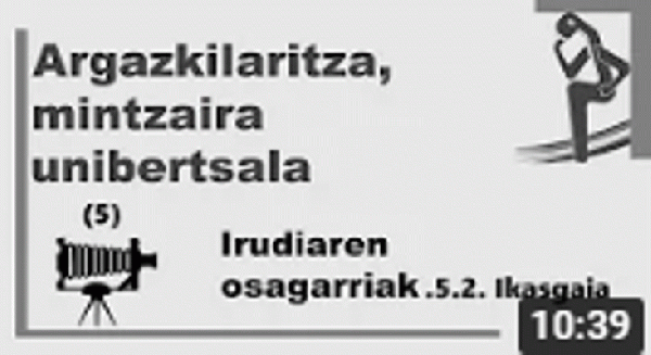 Argazkilaritza, mintzaira unibertsala (5) : irudiaren osagarriak 2 (ikasgaia) [Interneteko baliabidea - Bideoa] / [gidoia eta muntaia, Txetxo Serrano ; aurkezpena, Fran Urteaga ; irudiak eta argazkiak, Txetxo Serrano ... et al. ; aktorea, Joseba Elorza ; grafikoak, Joseba Elorza; soinuak eta efektuak, Koldo Ruiz de Azua]