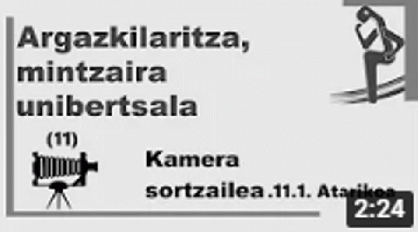 Argazkilaritza, mintzaira unibertsala (11) : kamera sortzailea 1 (atarikoa) [Interneteko baliabidea - Bideoa] / [gidoia eta muntaia, Txetxo Serrano ; aurkezpena, Fran Urteaga ; irudiak eta argazkiak, Txetxo Serrano ... et al. ; aktorea, Joseba Elorza ; grafikoak, Joseba Elorza; soinuak eta efektuak, Koldo Ruiz de Azua]