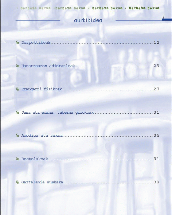 Aspaldiko kontua da inguruko herrietakoek esakera honekin eibartarrei adarra jotzen zietela, erdi euskara erdi gaztelera egiten omen zutelako: "Eibartarrena, hau da hau tienpua trigua maduratzeko". Ez dut uste nik Eibarren garia eraiten zen sasoian horrela hitz egingo zenik; hala ere, adarra jotzeko edozein aitzakia da ona. Baina, gaur egun nor ausartu adarra jotzen eibartarrei, takian potian entzuten diren horrelako esaldiak entzuten direnean: "*Jode Mikel, egindako kañua el no va más izan da" ; "Holako entradillak egin ezkero, ez dozu asko ligauko";" Superguaia da hau, tio"; "Zu zara plastia. Venga, no me comas la oreja!"; "Ba zubi zatixa jausi eta kolumnia mobidu egin zan, eta gu hemen gaoz, zelan esango neuke..., aislados del mundo esaten dana"*. Gaitzerdi, esango luke norbaitek duela hiru edo lau hamarkada ez bezala, gutxienez orain euskara edozein kale bazterretan entzuten da. Eta hori da gazteenek erabiltzen duten seinale. Bada, ordea, zerbait ondo ez dabilena: gauza gara molekula bat zer den euskaraz adierazteko; kantitatean ere irabazi egin dugu, euskara hiritartu den neurrian esparru berriak lortu ditugu, eta, gainera, gero eta gazte euskaldun gehiago dago. Hala ere, ez gara gauza gure lagunarekin zirriak egiten ari garenean euskaraz gauza goxoak esateko; kotxean gidatzen joan eta haserretuz gero, haserre hori euskaraz adierazteko edo lagunekin hitz egiten gabiltzanean zenbait gauza euskaraz erabiltzeko, *gilipollas, montar un pollo, tío bueno, maciza, estar al loro*..., esate baterako. Jakin dakigu, euskara gaurkotua eta modernizatua daukagula. Euskara batuak hartutako trenak, momentuz behintzat, ez du joan etorriko txartelik, geltokiz geltoki aurrera egitekoa baizik. Edozein modutan ere, euskara moderno horrek sarritan ez digu balio lagun artean edo kalean erabiltzeko. Eta hori da faltan sumatzen duguna; hain zuzen ere, hizkera bat falta zaigu elkarri adarra joteko; taberna baten garagardo batzuk hartzen gaudeanean baliagarria izango zaiguna; haserretutakoan edo pozik gaudenean adierazkorra dena... Euskararen adierazkortasuna, gure kasuan behintzat, gaztelaniatik dator, ez garelako gauza hizkuntzak behar duen gatza eta berakatza euskaraz sortzeko. Askok eta askok gaitasun horri sena deitzen diote, eta badirudi ihartu samarra daukagula, batez ere, herri haundi eta industrializatuetan edo-eta euskararen transmisioak eten bat izan duen tokietan. Ez da, ez, euskararen arazoa, euskara erabiltzen dugunona baizik. Askotan erremintak eta euskararen oinarri sendoa falta zaigu horrelako hizkerak sortzeko. BADIHARDUGU alkarteak aurreraxeago esandakoarekin jabetu eta gaiak daukan garratzia ikusita, taldetxo bat antolatu zuen aipatutakoaren inguruan hausnarketa egin eta materiala sortzeko asmotan. Eskuartean daukazun Berbeta Berua izeneko liburuxka da lehenengo emaitza, eta ez pentsa hori kezkaori - kale hizkera, lagun arteko hizkera, gazte hizkera edo dena delakoa- Deba Ibarrekoa denik bakarrik, Euskal Herriko leku askotan sortzen dabiltzalako horrelako liburuxkak edo materialak: Manxut, Frexkue, Zegamako Despektiboak, Irainka, Berbeteari Gatza eta Piperra, etab. Tradiziotik, gehienbat ahozko tradiziotik, abiatu ginen liburua egiterakoan, Deba Ibarrean eta osterantzean argiaratutako liburuak ere hustu genituen - Antzuolako Hizkera, Bergara aldeko Lexikua, Zirikidak, Lexikoia, Eibarko Euskeraren Esakerak, Hiztegi Erotikoa, Euskal Lokuzioak...- Hala ere, oso garbi genuen ez dakit nongo aitona-amonari behin edo behin entzundako hitzak edo esakerek ez dutela tokirik liburuxka honetan. Tradiziotik ekiteak arriskua dakar gure inguruan tradizioa baserri girokoa delako, eta gaurko gizartea hiritarra; orduan, arriskua da gaur egungo errealitaterako baserri girotik sortutako berbeta beroa erabiltzea. Tradizioa berbeta bero berri horren abiapuntu behar luke izan, kontuan izanda gazteek zailtasunak dituztela berbeta bero berri bat sortzeko. Hori ere etorriko da, eta asmatutakoa egoera berrietara egokituko da. Ordura arte, tradiziotik balio duena erabili eta ez duena hor geratuko da jasota, gustukua duenaren jakinmina asetzeko. Saiatu gara Berbeta Berua liburuxkan emakumeendako eta gizonezkoendako diren sarrerak bereizten -(e), (g)-; adibideak euskalki ez-jasoan ematen, eta gainera tokan eta nokan. Ez da, ez, oraingo errealitatea, toka eta noka galtzeko bidean daudelako gure kaleetan, baina kale hizkerak izan duen ezaugarrietako nabarmenena tratamendu hori izanda, eta hor ere tradizioari jarraitu diogu. Erromantiko hutsak garela dioenik izango da, hala ere, ez genuen gure burua lasai izango horrelako ahaleginik egin gabe. Ez dugu formula magikorik hau konpontzeko, baina bidea ekinez egiten da eta liburuxka hau biderako bizigarri txiki bat besterik ez da. Aprobetxatu baliagarria zaizuna.