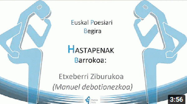 Euskal poesiaren hastapenak : barrokoa (5) : Etxeberri (Ziburukoa), Manuel debotionezkoa [Interneteko baliabidea - Bideoa] / [gidoia eta aurkezpena, Fran Urteaga ; errezitalariak, Iñigo Izagirre...et al. ; grabazioa eta muntaia, Txetxo Serrano ; grabazioa eta muntaia, Txetxo Serrano ; grafikoak, Joseba Elorza ; musika, Aitor De Olano]