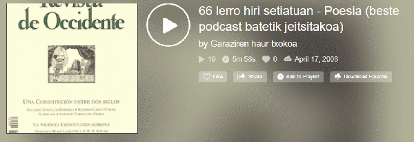 66 lerro hiri setiatuan [Interneteko baliabidea - Audioa] / iturria, "Kartografia" (Rikardo Arregi Diaz de Heredia) ; irakurlea, Pako Eizagirre ; grabazioa, Pako Eizagirre