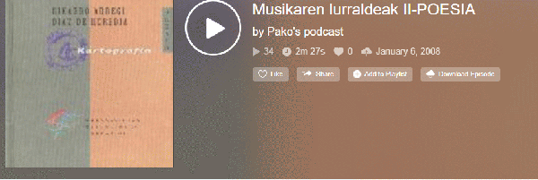 Musikaren lurraldeak II [Interneteko baliabidea - Audioa] / iturria, "Kartografia" (Rikardo Arregi Diaz de Heredia) ; irakurlea, Pako Eizagirre ; grabazioa, Pako Eizagirre