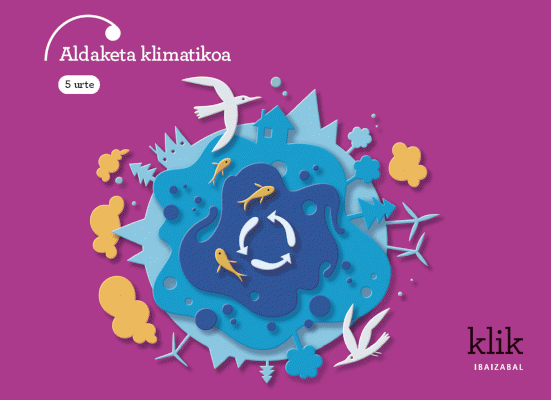 Adina / Maila: "Aldaketa klimatikoa 5 urte" materiala Ibaizabalek argitaratutako KLIK! proiektuaren barnean dago. KLIK! metodoak Haur Hezkuntzako bigarren zikloan proiektuetan oinarrituta ikastea ahalbidetzen du. Ikaslearen materiala karpeta batean dator bilduta, eta karpeta horrek proiektua lantzeko beharrezkoa den guztia biltzen du: koadernoa, hiztegi txartelak, familiarentzako aldizkaria...