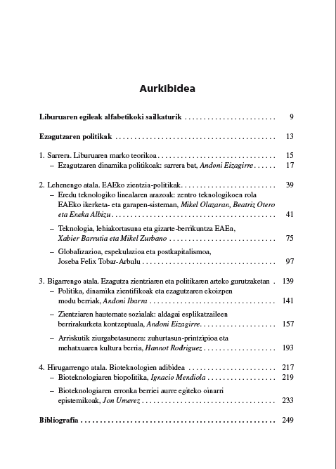 Ezagutza zientifikoaren dinamika politikoak ikertzea funtsezkoa da. Liburu honetan, azken urteotan eremu zientifikoan nabarmentzen ari diren gai nagusiak bildu ditugu: komunitate zientifikoan interes ekonomikoek lehenesten dituzte ikerketa-lerroak, aukera teknologikoak eta zientziaren erregulazio-politikak; zientzialarien ariketarako printzipio motibagarriak orain apenas diren kuriositatea eta askatasuna; zientzia ez da inuzentea eta herritarren pertzepzioak kritika ugarirako iturri oparoa dira; ezagutzaren eta gobernuen arteko harremanak moldatzearekin, zientzia-politikek izaera, ardura eta helburu berriak dituzte. Aukera bat izan zitekeen irudi tradizionala hautsi den argudiopean, fatalismoari amore ematea edo iragan oparo bezain inuzentea loriatzea. Guk, ordea, dinamika garaikideak aztertuz eta gizartean ardazturiko kultura zientifiko bat proposatuz, urteotako bilakaera ezagutu, lerroarteak arakatu eta irakurketa konplexuagoa aurkeztu nahi izan dugu. Bi mailatan osatu dugu zientziaren sozialitate berria: batetik, gure bizitzek ahalbidetzen dituzten ezagutza zientifikoa ekoizteko eta balioztatzeko estruktura sozial, ekonomiko zein politikoak ikertu ditugu; eta, bestetik, garaiko bizitza sozialean lehentasuna duen kultura epistemologikoa aztertu dugu. Horien irakurketa kritikoarekin, zientzia-, teknologia- eta berrikuntza-politiken oinarri zibikoak ahalbidetuko dituen elaborazio teorikoan sakontzeko ildoak atzematen saiatu gara.
