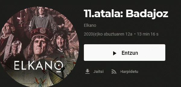 SoinuaSerie(ak): Jakintza. Ondarea-Historia-Artea (EITB podkast) ; ; 11 | Elkano (EITB podkast) ; ; 11Publication details: [Bilbo] : EITB, 2020Deskribapen fisikoa: Audioa (mp3) (14 min) : soinudunaGaia(k): Generoa/Forma:Sareko errekurtsoak:Adina / Maila: "Juan Sebastian Elkano, kapitain baten biografia" munduaren lehen itzulia kontatzen duen audio-liburua da, 13 kapitulutan kontatua. Elkano beraren begietatik gainera. Itsas gizonaren eraldaketa ere kontatzen du, bide batez. Parte hartu zuen bi espedizio ozeaniko handiek ematen diote eskarmentu hori. Hamaikagarrena atalean, "Badajoz" atalean, Carlos V.a erregeak zirkun-nabigazioaren errege agiria ematen dio Elkanori Indiatik espezieak ekartzeko egin zuen itsasaldi zailaren lekuko. Munduko bira eman izanaren aurkikuntza hark aro berria zabaldu zuen historian. Elkanok, nola nahi, ez zuen jaso mundu mailan ohore horren isla lortu azpi jokoa egin ziotelako zeukan Kapitain izaera aitortuz, atzerrian munduko biraren berri jakin zenean. Elkanok, arma baimena ere eskatu behar izan zuen mendeku arriskua ikusten zuelako.