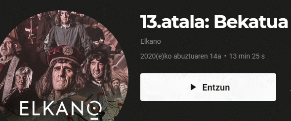 SoinuaSerie(ak): Jakintza. Ondarea-Historia-Artea (EITB podkast) ; ; 13 | Elkano (EITB podkast) ; ; 13Publication details: [Bilbo] : EITB, 2020Deskribapen fisikoa: Audioa (mp3) (14 min) : soinudunaGaia(k): Generoa/Forma:Sareko errekurtsoak:Adina / Maila: "Juan Sebastian Elkano, kapitain baten biografia" munduaren lehen itzulia kontatzen duen audio-liburua da, 13 kapitulutan kontatua. Elkano beraren begietatik gainera. Itsas gizonaren eraldaketa ere kontatzen du, bide batez. Parte hartu zuen bi espedizio ozeaniko handiek ematen diote eskarmentu hori. Hamairugarren atalean, "bekatua" atalean, Santi espiritu ontzia itsasoaren mende dago enbata handi baten erdian eta Elkanoren erabakiz, oihala zabaldu eta kostarantz doaz ziztu bizian kosta jo arte. Horri esker atera ziren bizirik, nahiz ontziak kalteak izan zituen. Enbatak, bata bestearen atzetik eta zailtasun handiak izan zituzten Magallaesen itsas artea zeharkatu ahal izateko. Elkanok bizitzan zehar egindako bekatuen ondorioz izango ziren horrenbeste zorigaizto? Itsas gizon batzuk ala uste zuten.