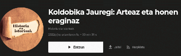 SoinuaSerie(ak): Historia eta istorioak (EITB podcast) ; ; 11 | Jakintza. Ondarea-Historia-Artea (EITB podkast) ; ; 11Publication details: [Bilbo] : EITB, 2022Deskribapen fisikoa: Audioa (mp3) (31 min) : soinudunaGaia(k): Generoa/Forma:Sareko errekurtsoak:Adina / Maila: Zer da artea? Nor da artista, eta zergatik? Zer garrantzia du arteak gaurko gizartean? Arteak, garatzen den gizartearen eta bizi duen garaiaren izaera irudikatzen du, ametsei eta helburuei forma ematen die, baina artea ez da beti edertasuna eta ilusioa. Koldobika Jauregi eskultorearekin artea eta bere eragina aztergaia, sarri boteretsuen eta agintarien menpe izan da da eta dago gaur egun ere. Artearen nondik norakoak aztertu ditugu artea bizitzeko modu gisara duen artistarekin, Koldobika Jauregi eskultorearekin aztertu dugu Historia eta istorioak podcastaren atal honetan.