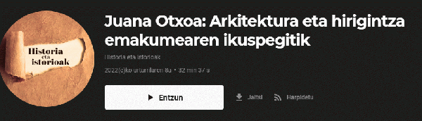 Juana Otxoa (Urdiain, 1969) arkitektoarekin batera etxegintza eta hirigintza aztertu ditugu Historia eta istorioak podcastaren 12. atalean. Gaur egungo etxebizitzek, eraikuntzan orain arte ez zeuden erronkei erantzun behar izan diete, besteak beste, eraginkortasun energetikoari. Horrez gain gaur egun familia eredu asko dago eta familia modu bakoitzaren beharrak ase behar dituzte eraikinak egitea ogi bide dutenek. Arkitektura gainera, gizonen eremua izan da historian, baina orain berriz gero ta emakume gehiago ari da esparru honetan lanean. Hauek beste ikuspegi eta irizpideak dituzte beren lan egiteko moduan, agerikoa da eraikinetan bezala hiriak antolatzeko moduan. Juana Otxoa arkitektoa, COAVNA Euskal herriko arkitektoen kolegioko presidentea da egun eta hogei urtetik gora daramatza arkitekturaren arloan murgilduta.
